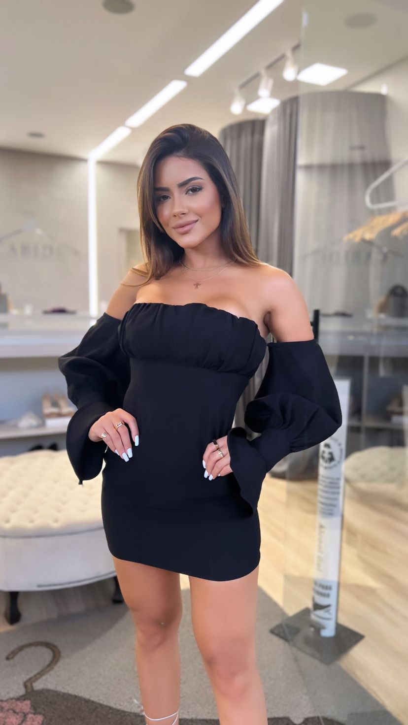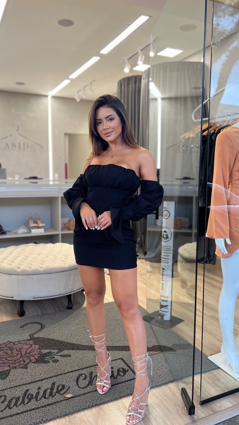 Vestido tomara que caia em alfaiataria, com detalhe franzido no busto e manga longa