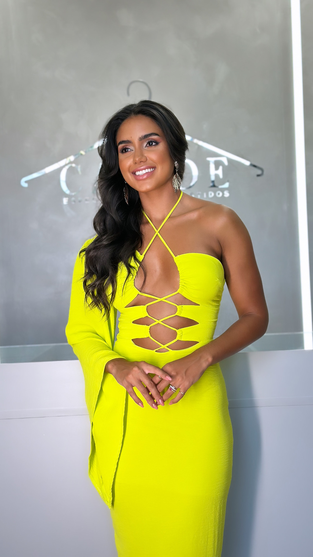 Vestido longo de um ombro só, em alfaitaria com amarração cruzada na frente